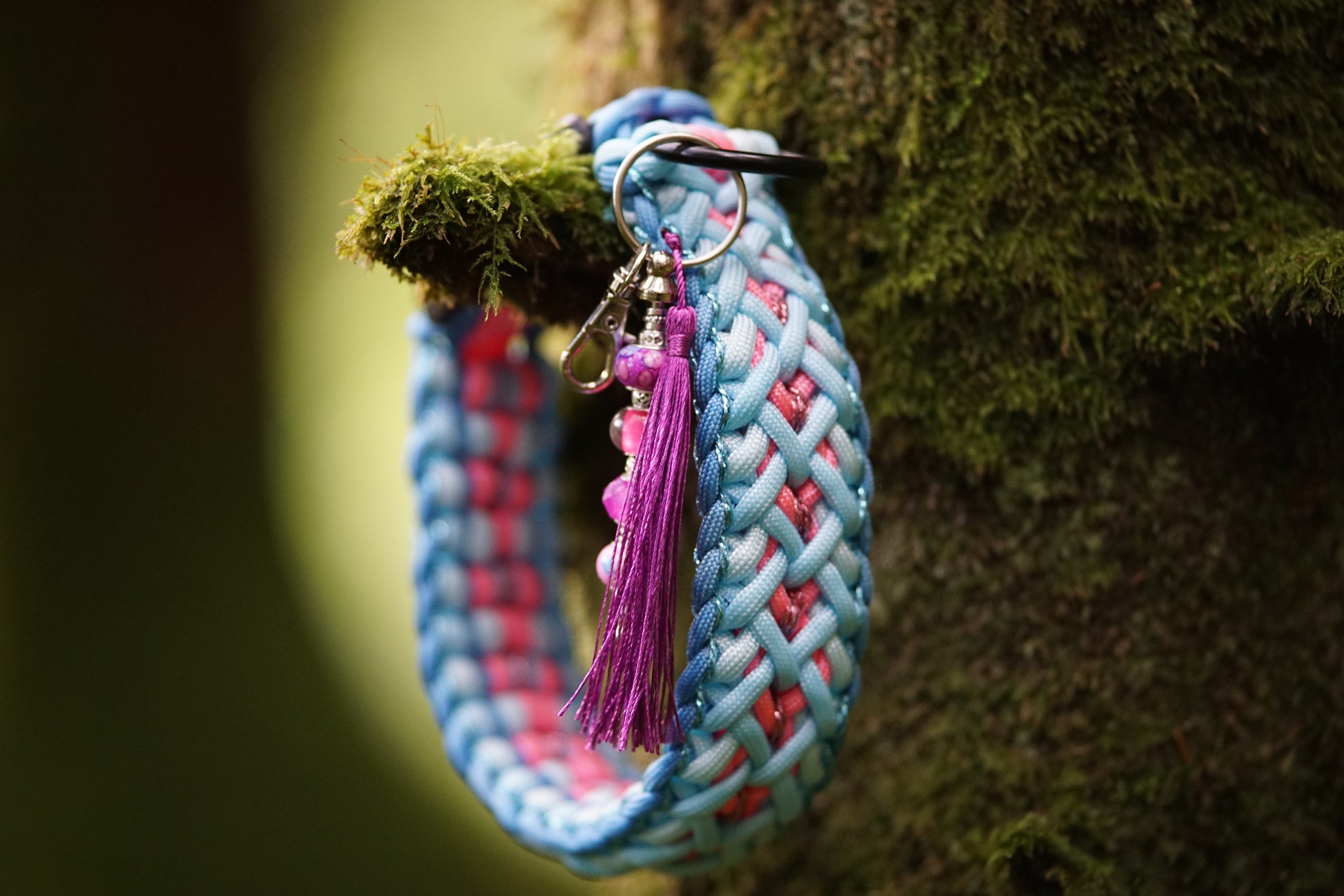Flettet i paracord 550 som er slitesterkt og har et bruddstykke på 250kg. Skylles enkelt i vann og tørkes.