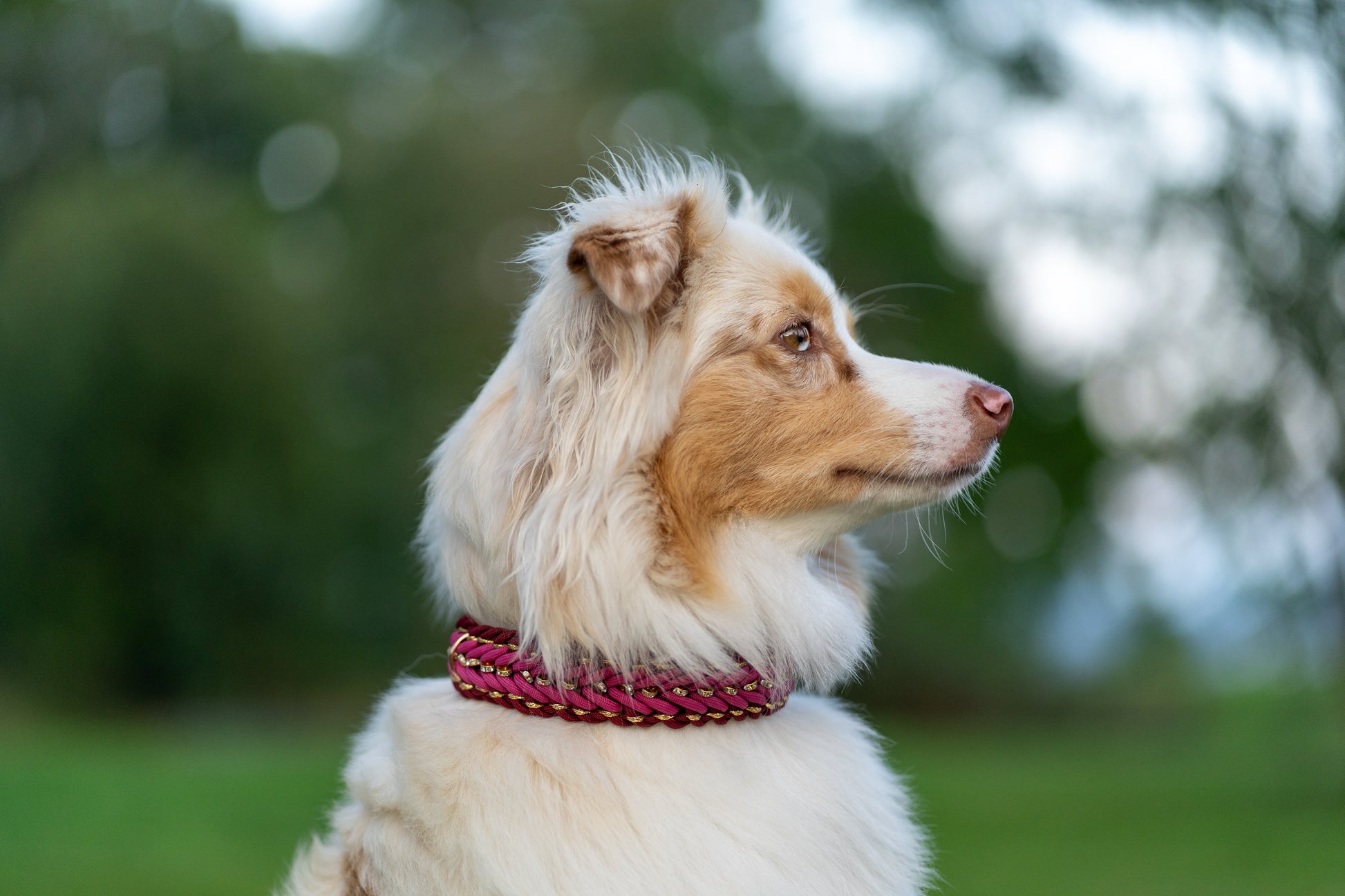Halsbåndet kan lages i ulike farger og kombinasjoner og etter hundens mål.